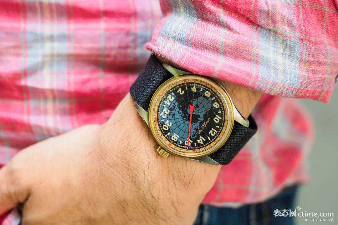 24小时款风格独特,戴在手腕上非常的出挑,腕表刻度采用24小时显示,表盘中央唯一的一根大红指针成为视觉焦点。仅靠这一根中央红针就可以准确读时。如果你位于北半球,这枚腕表还能充当指南针的功能,只需将中央红针对准太阳,你就能知道自己面对的正确方位(如果身在南半球,方向标识则正好相反)。盘面用夜光涂层精细绘制出北半球大陆版图图案,配合经纬度标线、米色24小时时标和青铜表圈,复古韵味十足。