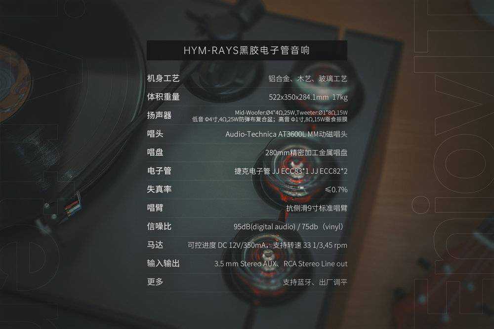 开箱之前直接放上这款有些不一般的黑胶产品——HYM-RAYS黑胶电子管音响的整体参数,仅从纸面上能看到的最大亮点在于其扬声器和电子管。内置2个1寸高音单体、2个4寸低音单体。捷克电子管JJECC83*1JJECC82*2。