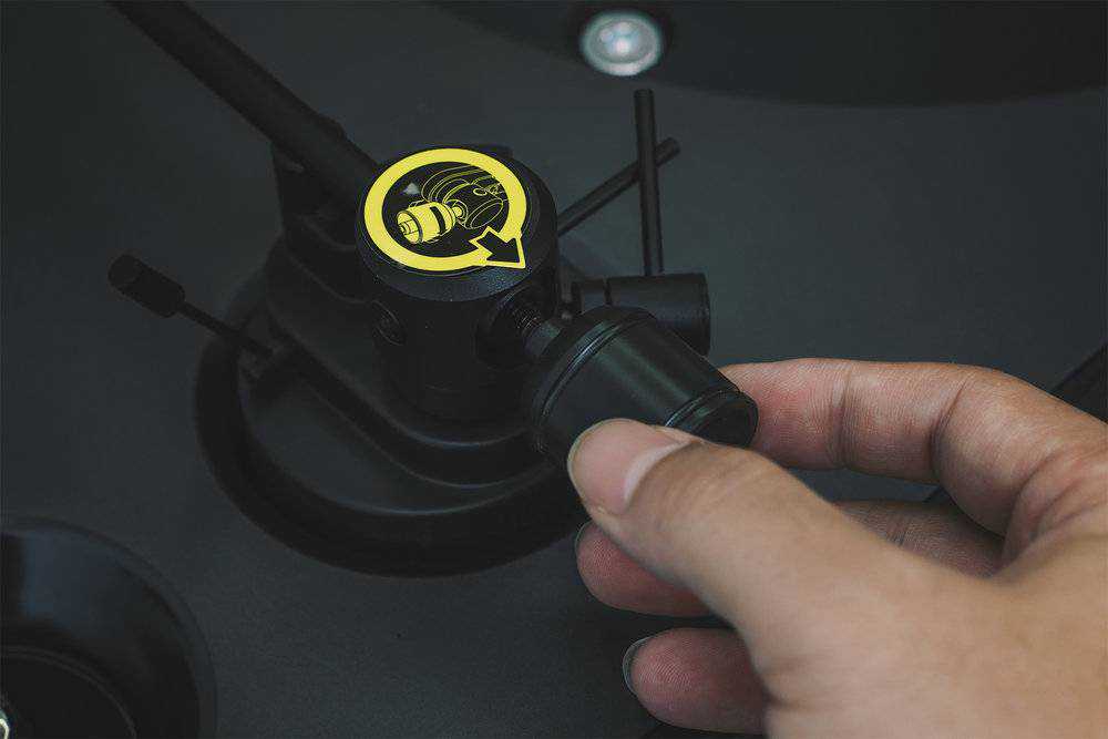 不是第一次接触黑胶,所以一开始没看说明书直接上手了。首先把配重铁安装到唱臂末端,这里有个细节,通常我见到的黑胶机子都是通过旋转配重铁来调整唱头的针压,而HYM的RAYS则是一步到位,没错,你直接把唱臂后面的平衡锤拧到头就行,它出厂前就适配好了默认的唱头。避免像常规黑胶机子那样来回反复调整配重头。