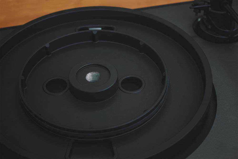 我们再看这个即将按上去的唱盘背面,家里原先的老黑胶机唱盘背面喷漆不均,还有很多毛刺。而这台有更高追求的黑胶机即便在这个不容易看到的唱盘背面细节自然也没放过,喷漆均匀到位,触感润滑无毛刺。