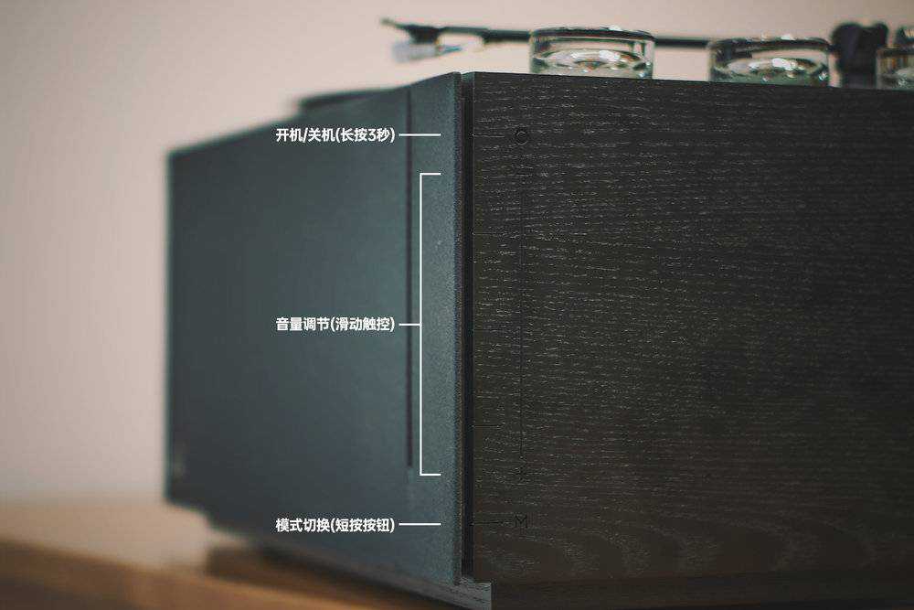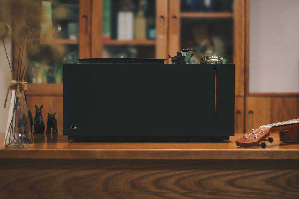 几步简单的操作之后,这台颇具设计质感的HYM-RAYS黑胶电子管音响就安装完毕了。整体设计也是吸引我的重要原因之一,没有任何让你觉得多余的设计和浮夸的点缀。顶面的珍珠黑金属加上侧边的黑胡桃木让这台产品颇具品质感。