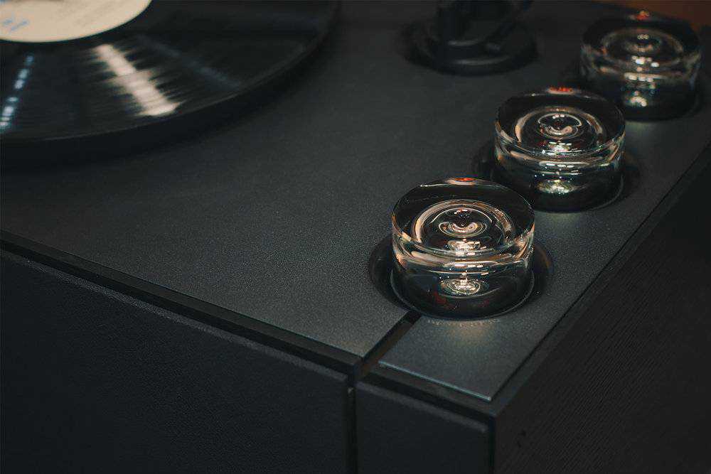 打开玻璃罩,里面就是Hi-Fi大佬们最爱的电子管了,电子管音响本就少见,黑胶电子管音响就更为罕见了。但这也符合HYM-RAYS的高端定位。采用了捷克进口电子管,它采用了2段式前极,3个电子管的中间那个为第一层,为JJECC83S。头尾两个分管左右声道电子管为JJECC82。