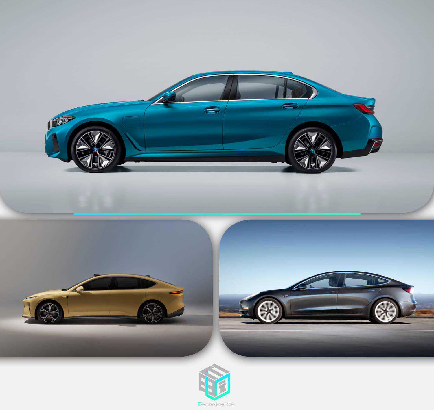 车身侧面,三台车依旧保持了自己的风格。i3腰线与侧面下方“鲨鱼腮”通风口相连,优化车身空气流动的同时也给车辆带来了动感的体现。选装的19寸轮毂也已经采用了低空阻的设计,粗细辐条的结合十分具有精致感。ET5的溜背造型则保障了车侧修长的流线,搭配后备厢盖上的上挑鸭尾,整车气质相较i3更为运动。Model3车身侧面更为圆润,圆弧形的车顶拉高了车辆的视觉高度,给人留下了“胖嘟嘟”的观感。