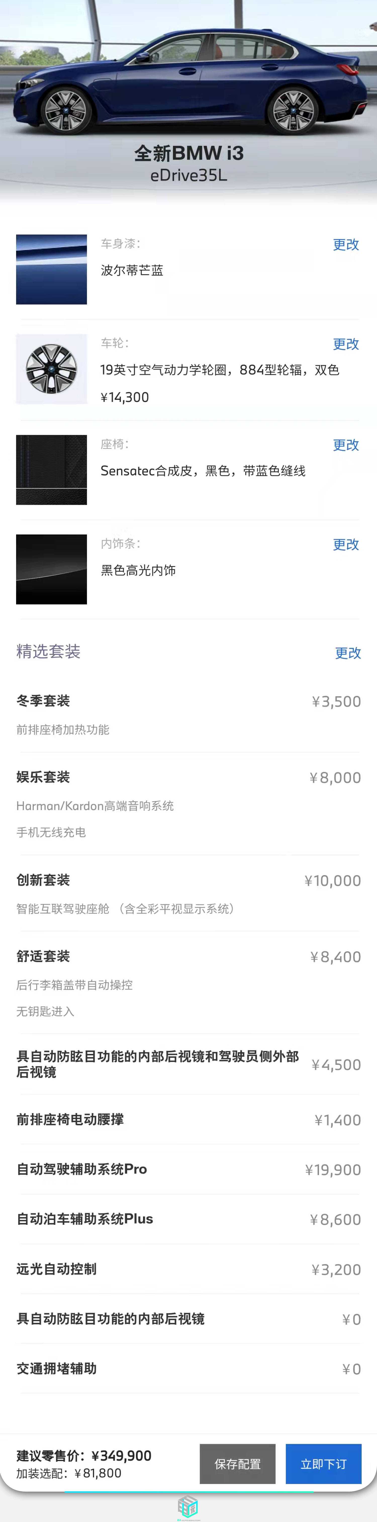 相比于充沛的空间和安心的操控,i3的配置可以说是应有尽无。选装包从3,500元的座椅加热,到10,000元的抬头显示,再到19,900元的自动驾驶辅助Pro包,选装种类之多以至于编辑部各位老师都感叹光看售价的我们还是太年轻了。选到各位老师觉得相对比较合适的配置一看,整车价格已经来到了43万元(注:此时选配并未选满)。佩服佩服,着实有当年“两千预算进卡吧,五万神机抱回家”那味道了。