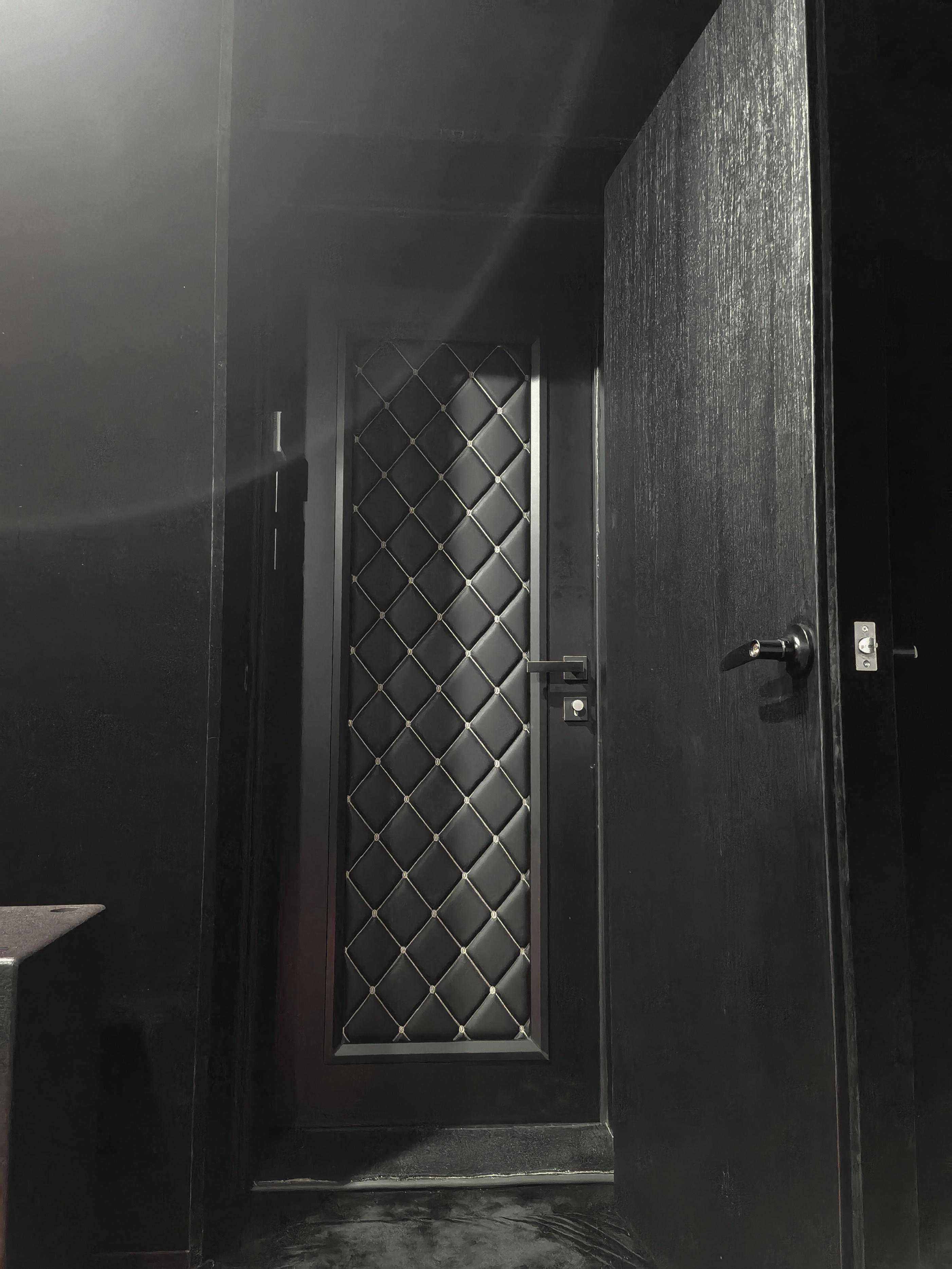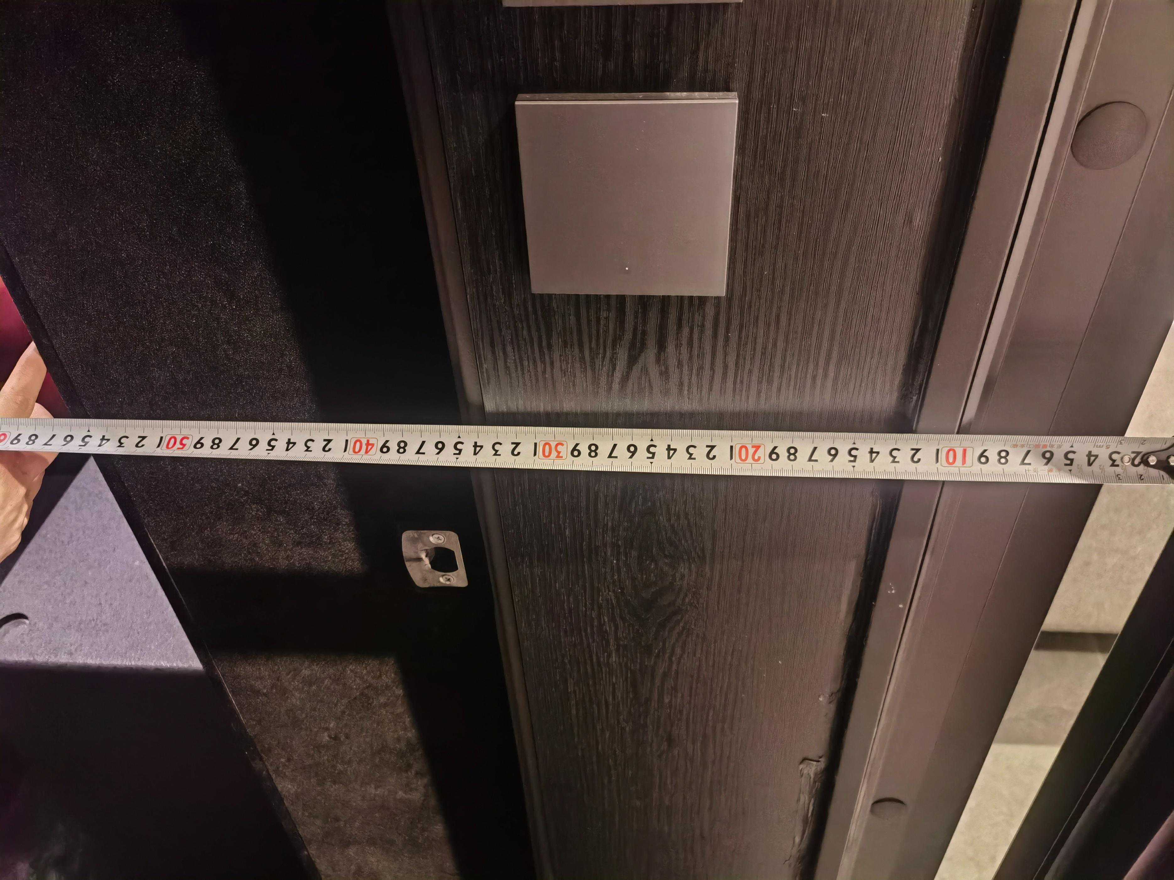 他的影院在负一楼,影院房间的毛坯面积是7.95×4.26=33.86㎡。做完声学后,可视面积缩小到5.7×4.1=23.4㎡,足足小了10㎡,可见这个声学用料(隔音加声学模块)是多么的扎实。声学墙的厚度竟然高达60cm,然后用了2扇隔音门,具体的隔音表现,后面揭晓。