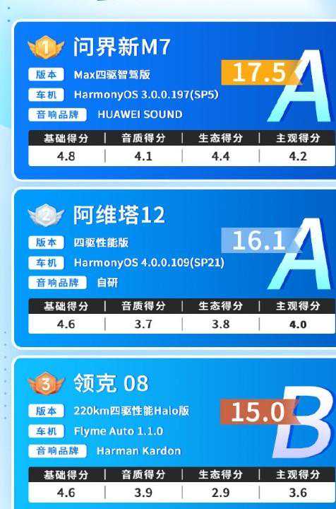 紧随其后的是阿维塔12四驱性能版,以16.1分位列第二,该车配备了(SP21)车机系统,音响系统为自研。领克220km四驱性能Halo版则以15分排在第三位,采用车机系统,音响品牌为HarmanKardon。
