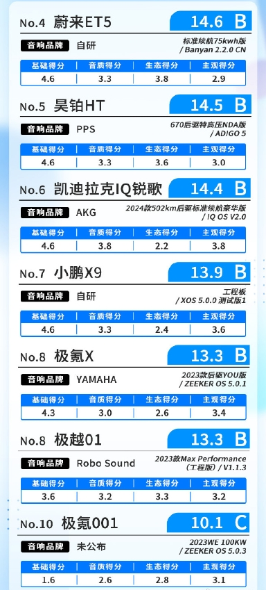 蔚来ET5、昊铂HT、凯迪拉克IQ锐歌分别以14.6、14.5、14.4分位列第四、第五、第六。小鹏X9以13.9分位列第七。极氪X和极越则以13.3分并列第八。而极氪001以10.1分排在第十位。