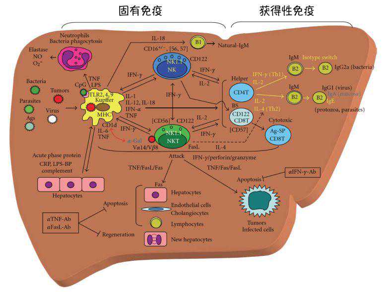 肝脏是传统意义上的“免疫豁免器官”,具有复杂的免疫调控系统1。肝脏的固有免疫系统存在多种免疫效应细胞,如Kupffer细胞、NK细胞、NKT细胞,以及CD8+CD122+T细胞等。细菌和毒素等进入门脉系统和全身循环,会激活Kupffer细胞产生IL-12,通过IFN-γ/穿孔素/颗粒酶途径诱导NK细胞、NKT细胞和CD8+CD122+T细胞产生强大的抗肿瘤活性;外周血中的CD16−CD56++NK细胞也参与抗肿瘤作用。