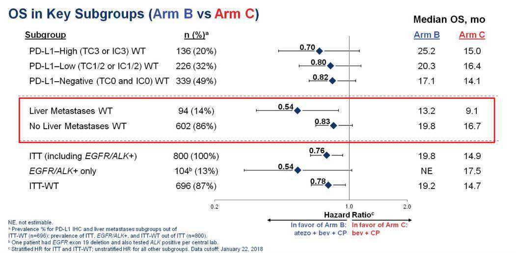 而IMpower150研究结果显示,在肝转移人群中,atezolizumab+贝伐珠单抗+化疗观察到OS临床获益,且获益超过无肝转移的患者亚组5。