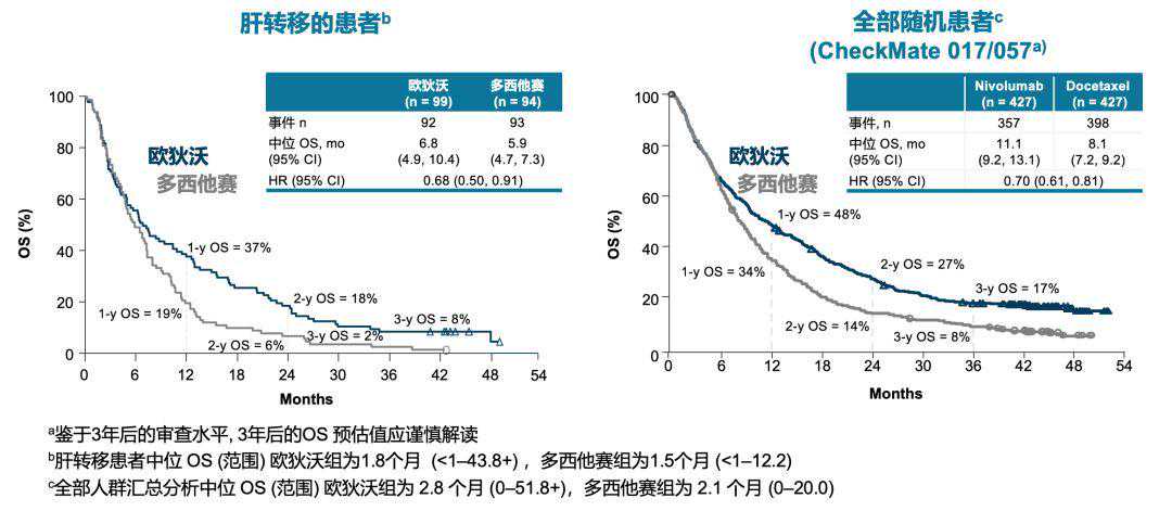 CheckMate017057研究汇总分析显示,与多西他赛相比,纳武利尤单抗改善了肝转移患者的OS,与整体研究人群的结果一致6。虽然整体预后劣于不伴肝转移的患者,但相较标准化疗,伴有肝转移的患者仍然可以从纳武利尤单抗治疗中获益。