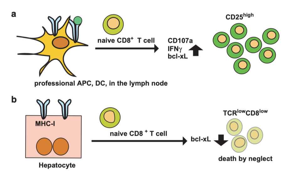肝脏是T细胞激活的主要器官之一,但T细胞在肝脏中的激活却是不完全和不佳的;导致T细胞耗竭,效应功能抑制和早期死亡。在二级淋巴器官中,DC介导的T细胞致敏,导致T细胞克隆的扩增以及效应功能激活。而在肝脏中,肝细胞作为非常规APC致敏幼稚CD8+T细胞,却导致“无选择死亡”(deathbyneglect)9。