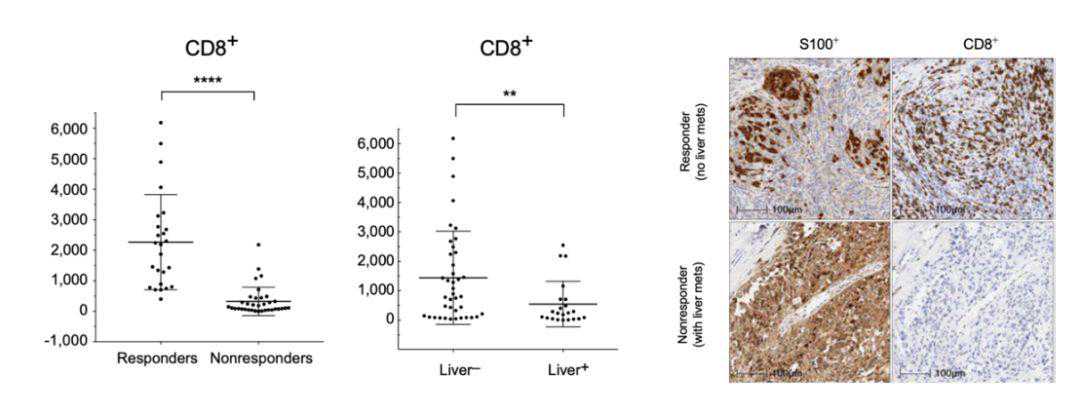 来自黑色素瘤肝转移的一项研究表明,接受帕博利珠单抗治疗的黑色素瘤患者活检样本的数据显示,肝转移灶肿瘤侵袭边缘的CD8+T细胞计数减少,与肝转移患者的治疗反应差有关10。究其原因,肝脏协助维持了局部的免疫微环境,肝脏诱导的外周免疫耐受可能影响免疫治疗效果。