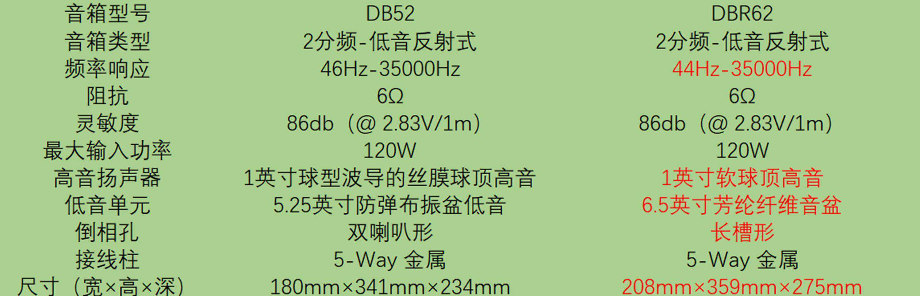 ▲我们来看一下ELACDBR62和DB52的具体参数对比。可以看出,二者在扬声器单元和倒相孔形状上有明显区别。