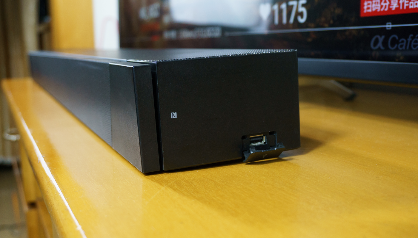 音箱右侧面是NFC和USB插口位。当使用带有NFC功能的手机或便携播放器时,即可做到随碰随播的快速连接。而USB接口可以插入U盘等移动设备,读取里面的音乐文件。除了普通的MP3、WMA、AAC等格式外,索尼HT-ST5000还支持DSD、DFF、FLAC、APE、WAV等高音质格式。