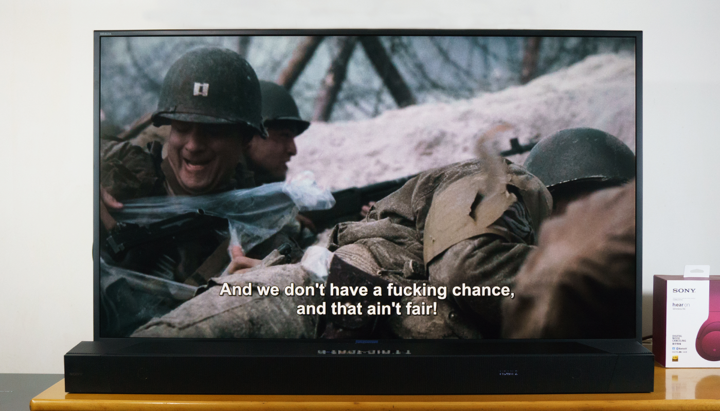 直接先试一部带有全景声的《拯救大兵瑞恩》吧。开场长达20分钟的奥马哈海滩战只能用壮烈来形容。在登陆艇上,可以感觉到炮火身边的远处爆炸,然后水从头顶降落。打开艇门时,敌方碉堡的扫射子弹从我的正面出现。瞬间各种呐喊声与子弹交织成了一片,场面一度混乱起来。断臂残肢,血液飞溅,医护兵的呼唤此起彼伏。