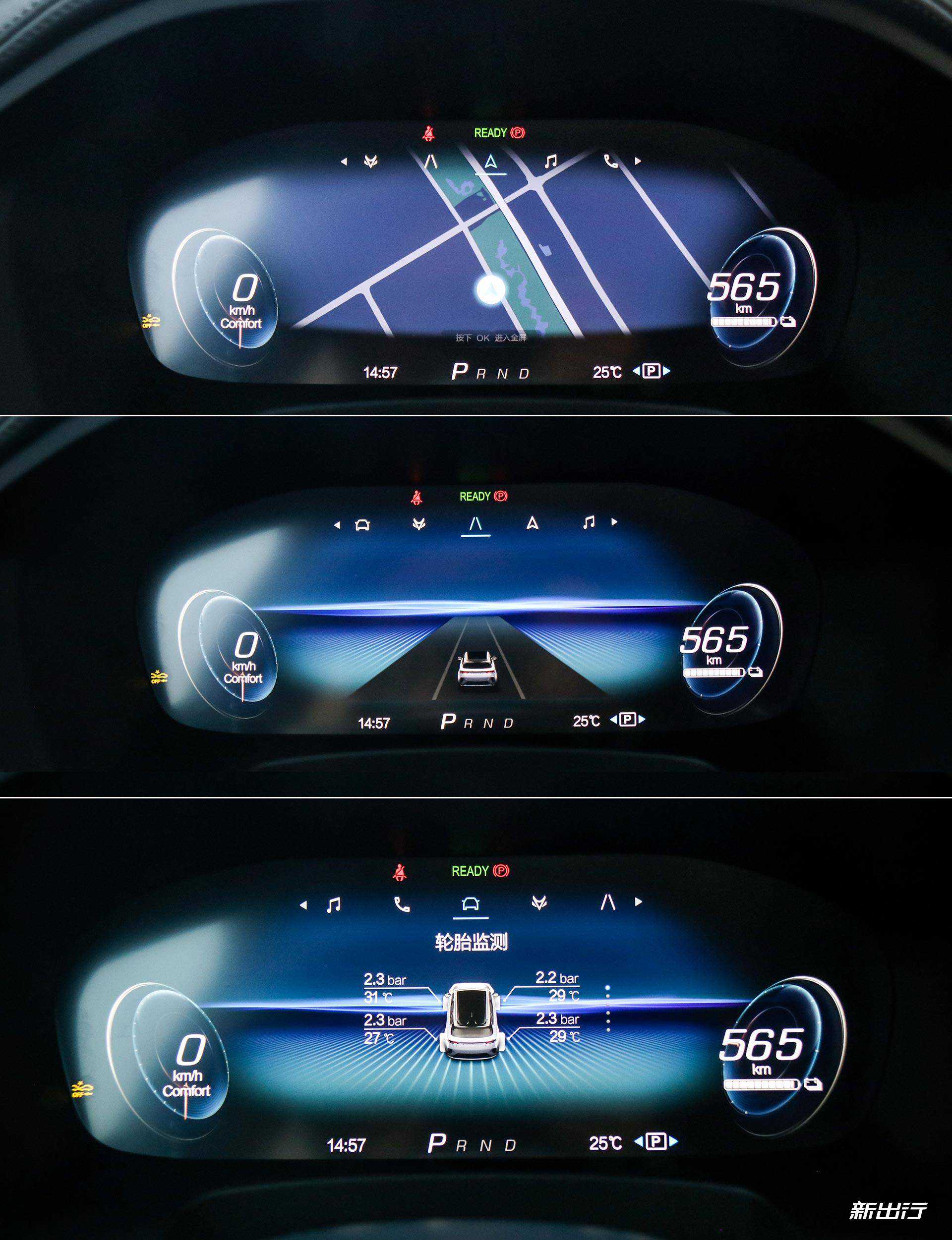 全液晶仪表盘尺寸为12.3英寸,左侧是时速表,右侧是电量和剩余续航。中间是多功能显示区域,可以显示导航、ADAS交互、多媒体等。通过方向盘左侧的切换按键可以切换显示的信息。