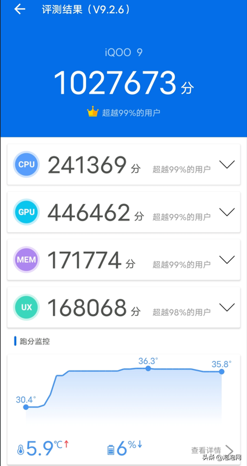 性能方面,iQOO9标准版搭载了新一代骁龙8旗舰处理器,其采用最新一代4nm制程,并首次基于全新的ARMv9底层架构,相比骁龙888的峰值性能提升了20%,同性能下功耗降低30%。集成Adreno730图形处理器GPU性能最高提升60%,功耗降低25%,游戏性能获得大幅提升。在安兔兔V9的性能测试中,iQOO9获得了超过102万分的成绩。