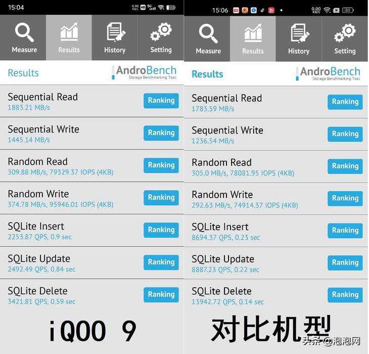 此外,iQOO9配备了理论速率可达6400Mbps的增强版LPDDR5,并首发、具备全新Solvit智能控制的三星超频版高速存储芯片,带来更快的应用调取与缓存速度。在读写测试中,iQOO9相比同为骁龙8Gen1平台的竞品,在连续写入和随机写入性能方面都有一定领先。