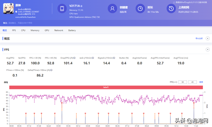 即使是在最考验性能的全高画质《原神》当中,iQOO9跑璃月港这种高负载场景的帧率也很少掉到45帧以下,且没有出现锁帧的情况,平均帧率达到52.7帧,表现也十分好。