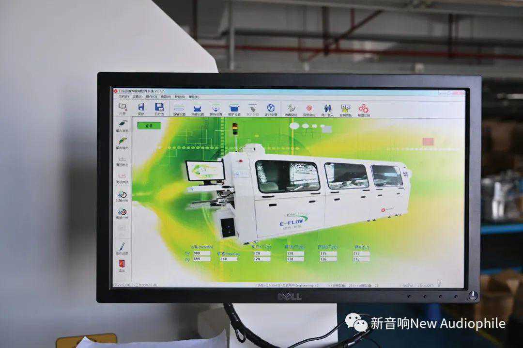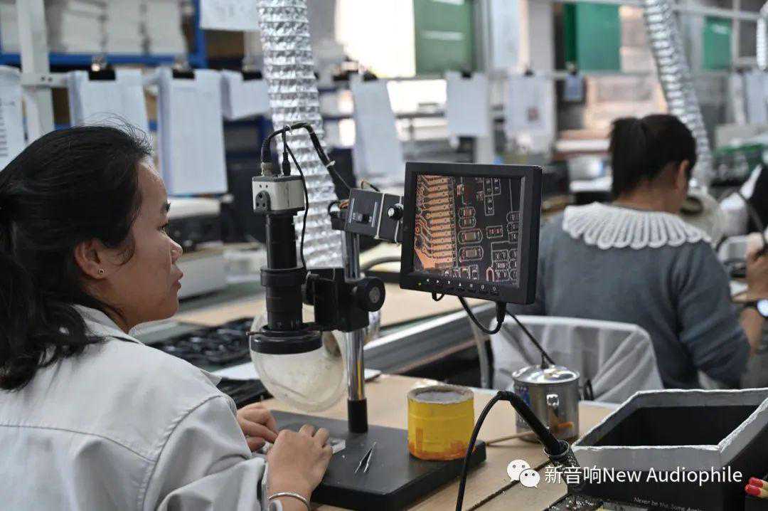 借助数码显微镜接插电路板,这需要技术娴熟的技工。虽然是纯手工焊接,但会借助电子设备辅助检验达到工业标准,每一种电子管的特性不一样,电路的搭棚都不同,因此生产线上每位技工的电脑显示器上都有相应的标准作业图。