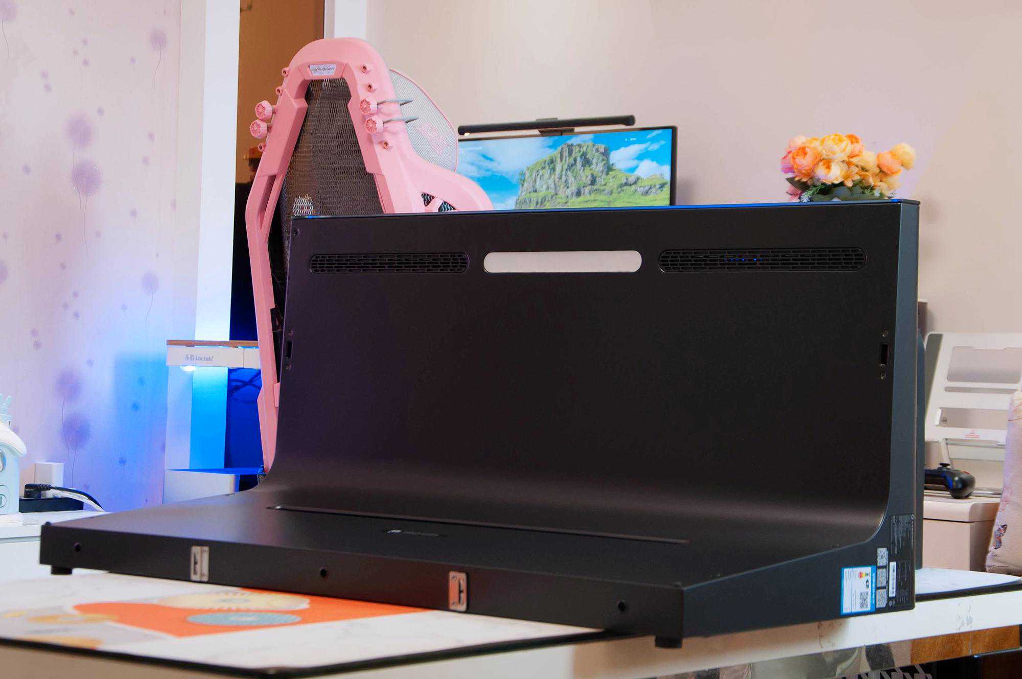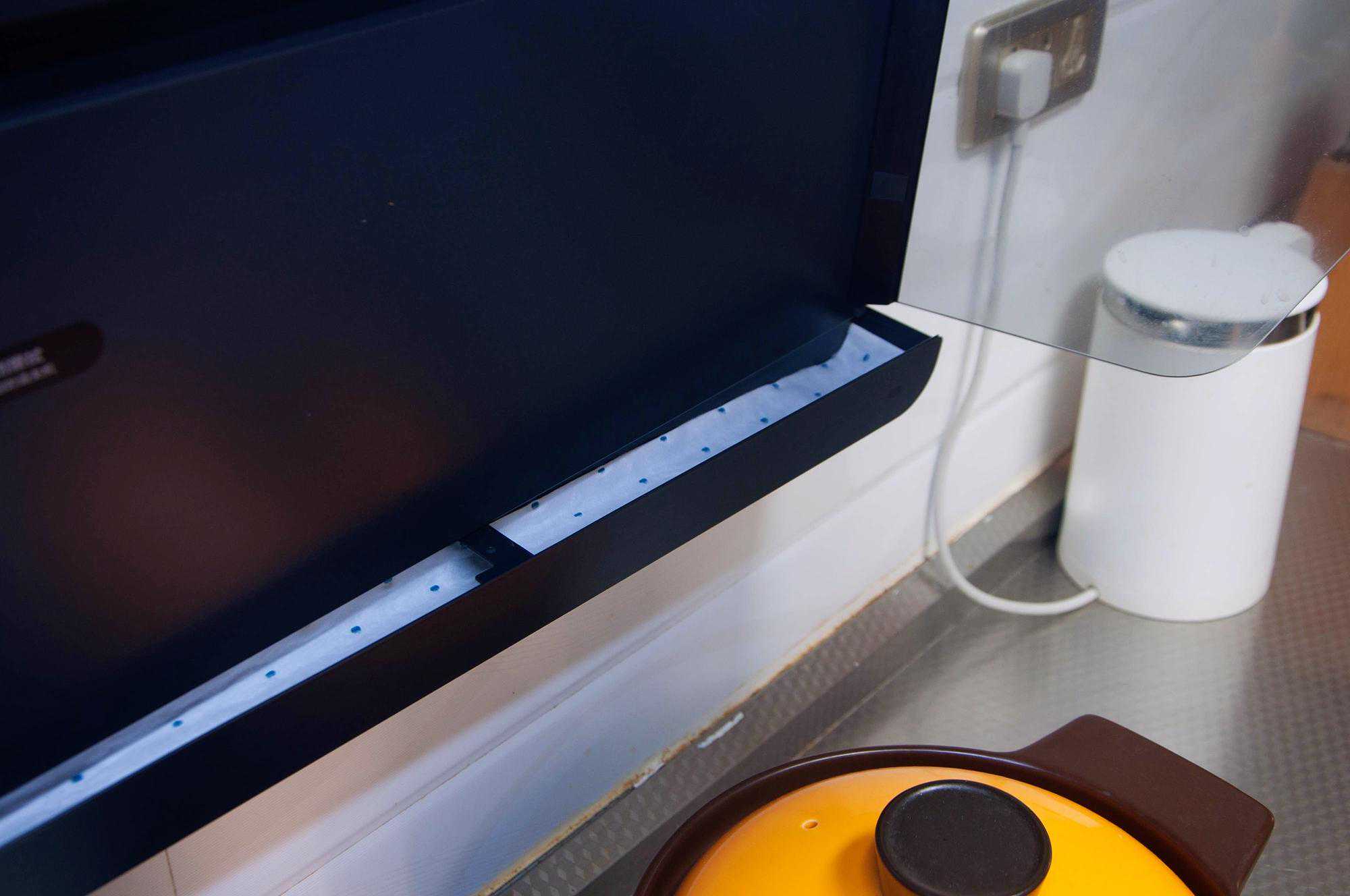 功能方面,支持烟灶联动和手势操控,出厂时操控面板区域粘贴有功能引导贴,待大家熟练各功能的使用方法后将其揭除即可。看到右上角的白色小三角了吗,从这里可以掀起贴纸,轻松揭除。我认为隔空手势感应功能是用过就回不去的体验,右挥开机,继续右挥调节档位,左挥关机,全程都不需要碰触,避免满手油污弄脏烟机。
