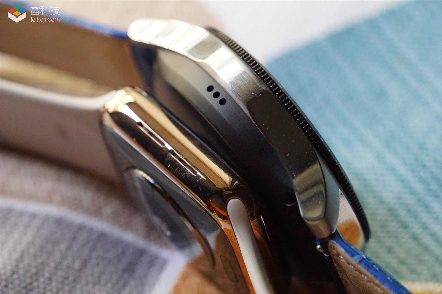 二者左侧都配备了扬声器用于外放声音,但不同的是GalaxyWatch的开孔其实是在背壳上,而AppleWatch则是在金属中框上。