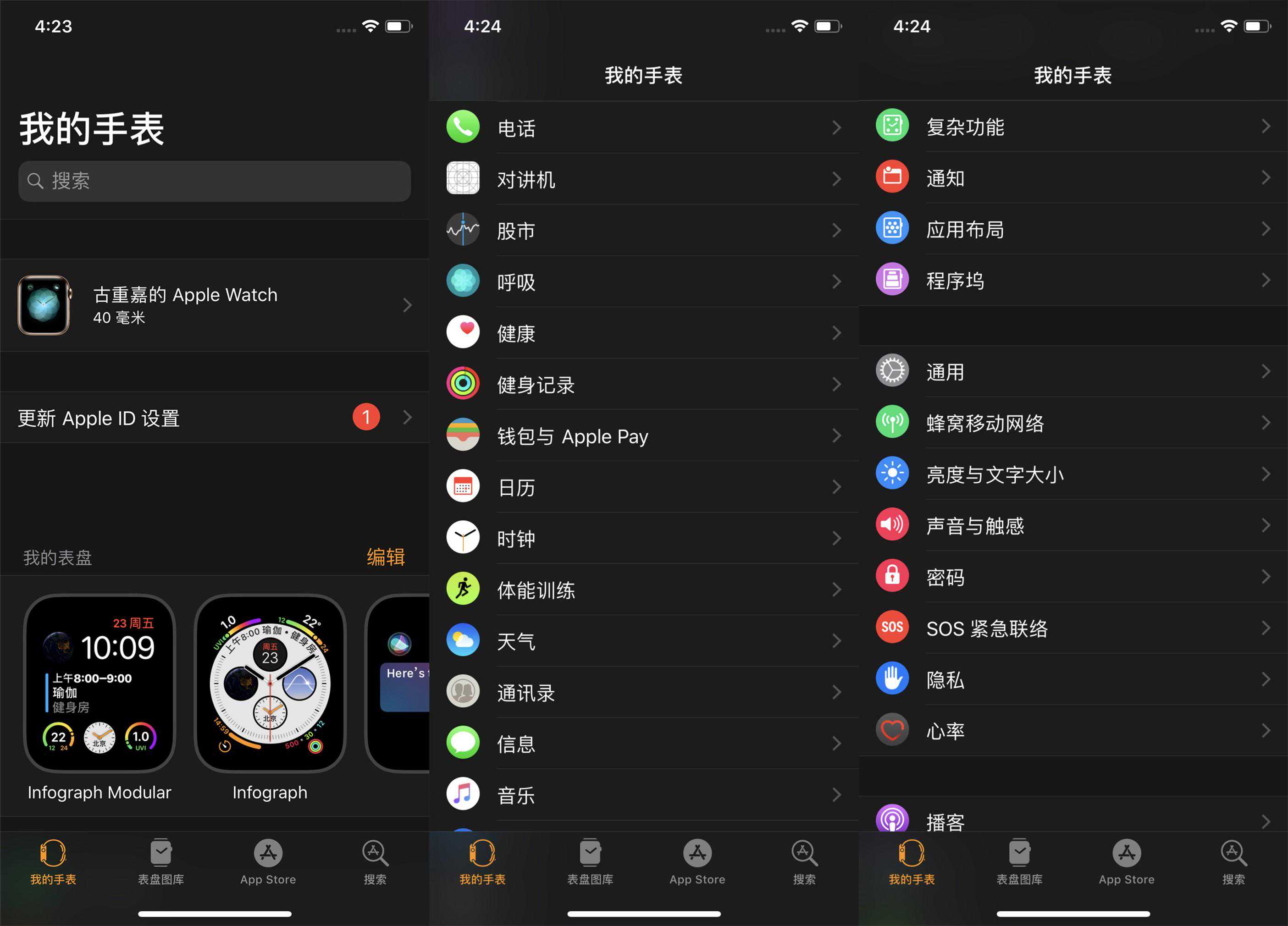 新款AppleWatch则是通过iPhone内置的Watch应用控制。该应用同样可以设置手表的各项功能,添加表盘,进入应用市场等。但不同的是,由于苹果系统的封闭生态,其只支持同步手机的相片和音乐到手表中,不能直接传输歌曲到手表内。