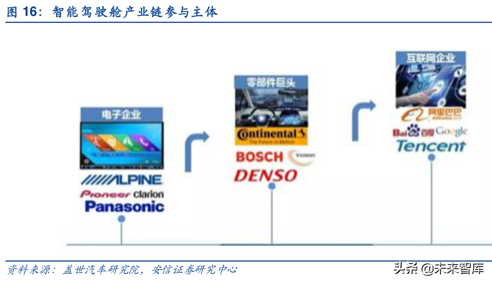 智能驾驶舱较传统驾驶舱增配部件,市场空间显著提升。传统驾驶舱仅包括机械仪表盘、车载信息娱乐系统,而智能驾驶舱包括全液晶仪表盘、车载信息娱乐系统、HUD、语音交互、流媒体后视镜等主要部件,单车价值量成倍增加,市场的扩容利好行业参与者。智能驾驶舱主要参与者包括汽车零部件巨头、电子企业和互联网企业。与外资整车厂共同成长起来的外资巨头零部件公司拥有深厚的技术沉淀,且与整车厂关系密切,是智能驾驶舱的重要参与者,具体包括伟世通、大陆、博世等。电子企业由于具备核心软件技术,并通过产业链整合也在座舱电子市场占有一席之地,具体包括歌乐、阿尔派、先锋等。互联网企业属于后来者,凭借其软件和大数据资源顺利切入座舱电子领域,在推动人机互联方面有着得天独厚的优势,具体包括百度、谷歌、阿里巴巴等。