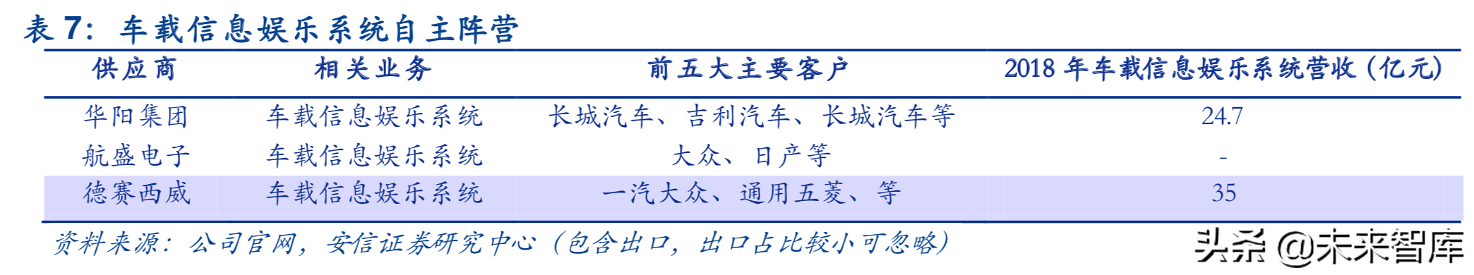 合资和自主供应商瓜分国内空间。从事前装车载信息娱乐系统业务的自主前三大供应商分别是华阳集团、航盛电子与德赛西威三家公司,由于航盛电子非上市公司,无公开车载信息管理系统数据,2018年华阳集团、德赛西威的车载信息娱乐系统营收规模分别为24.7亿元、35亿元,对应325亿市场空间市占率分别为7.6%、10.7%。此外,伟世通、大陆、歌乐等外资企业在国内建有合资公司,以伟世通为首的部分合资公司深度绑定国内主机厂,占据较大份额。