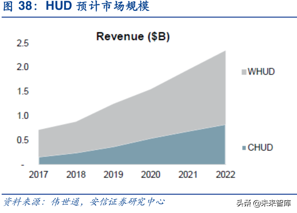 HUD即抬头显示器,是HeadsUpDisplay的缩写,是目前普遍运用在航空器上的飞行辅助仪器以降低驾驶员低头查看仪表的频率,避免注意力中断以及丧失对状态意识的掌握。在大尺寸中控屏尺寸备受追捧的当下,车载显示产生了分散驾驶员注意力的安全隐患,车载HUD应运而生,最早出现在80年代末,随即2001年、2004年通用、宝马分别推出彩色HUD,随着技术逐渐成熟,HUD目前已普遍运用在豪华车上,部分日常家用汽车亦有装载。