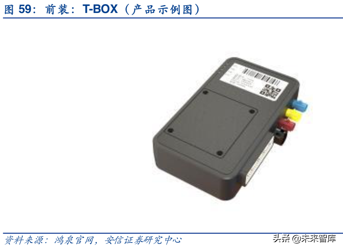 汽车终端的前装设备俗称T-Box(TelematicsBOX),即车载微软系统,它依托无线通信、卫星通信(GPS/北斗)和CAN总线集成等技术,向车主提供道路交通信息、导航信息、远距离车辆诊断、车联网远程控制以及互联网服务等,可以和后台系统/手机APP通信,实现手机APP的车辆信息显示与控制。由于在汽车出厂前安装,整车厂是T-BOX行业渗透率的主要力量。