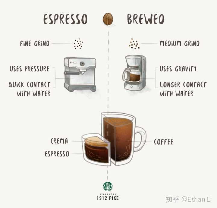 而萃取咖啡在制作过程中会让磨成粉末的咖啡和水保持一定的浸泡时间,让咖啡豆的风味可以充分溶解到水里。这个溶解吸收的过程就叫萃取。浓缩和萃取的分类方式或许会让人容易混乱,难道浓缩咖啡的制作过程就不是萃取吗?我们可以看一张来自星巴克的图来理解浓缩和萃取的区别。