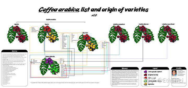 上面这个图比较小,请通过连接打开看。我们不需要去花时间记住不同品种的名称、产地和味道特点,只要知道有Typical和Bourbon这两大类就好了。之后慢慢接触到自己喜欢的咖啡豆时,再去了解具体的产地和品种名。