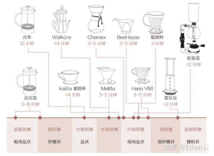 研磨是属于冲泡过程中的前期准备,需要的粗细度只跟你的制作方式(制作工具)有关。器具不同,所需的研磨程度不同。参考下图即可: