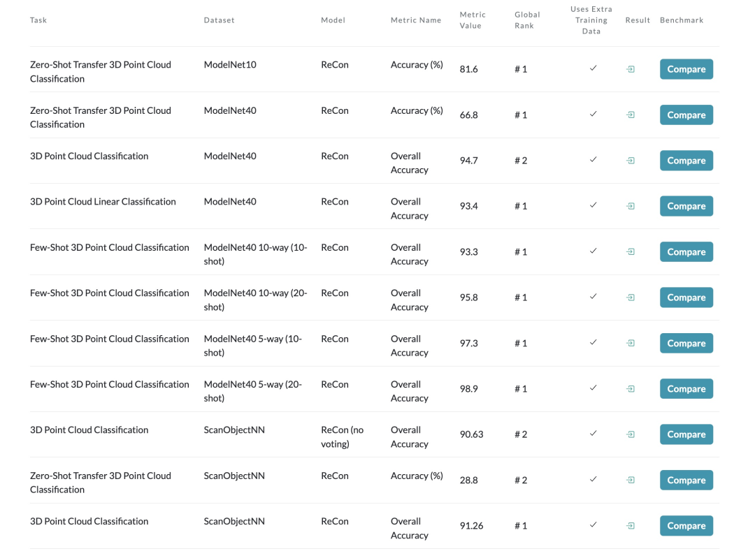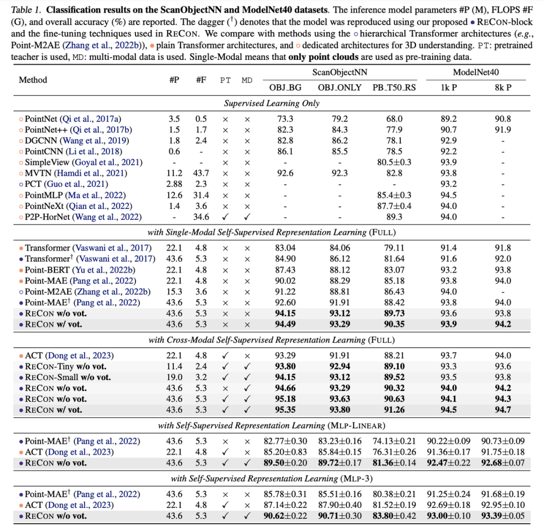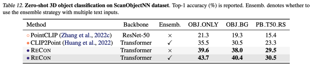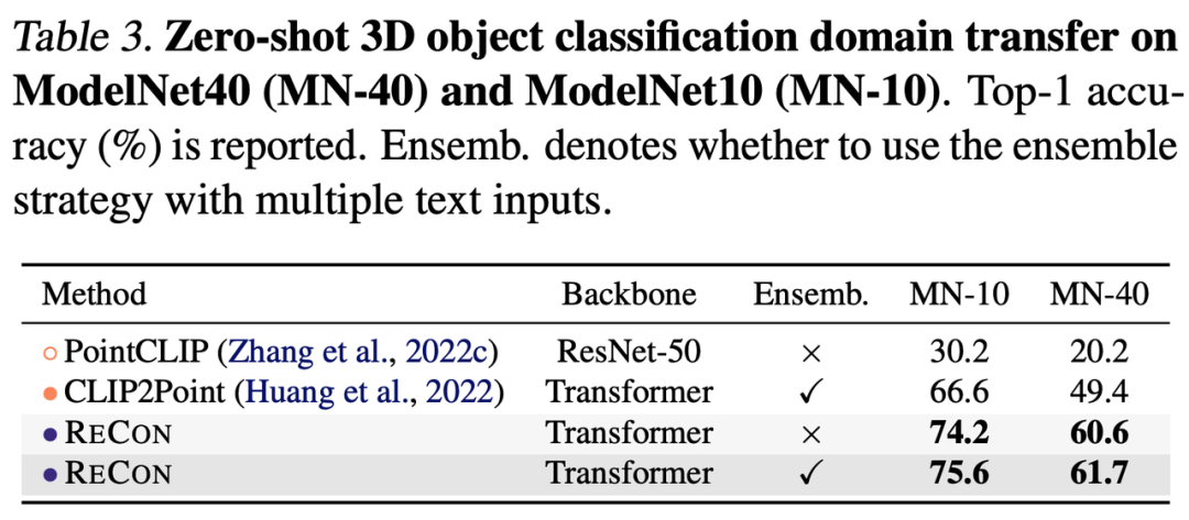 ReCon大幅提升了3D表征学习的效果,在点云分类与Zero-Shot中均取得了SOTA的性能。但我们认为ReCon发现并解决的问题并不是在3D中特有的,在其他缺乏数据,或相对缺乏数据的模态中依然有可能有效,我们希望有更多ReCon-Style的架构在更多领域出现。