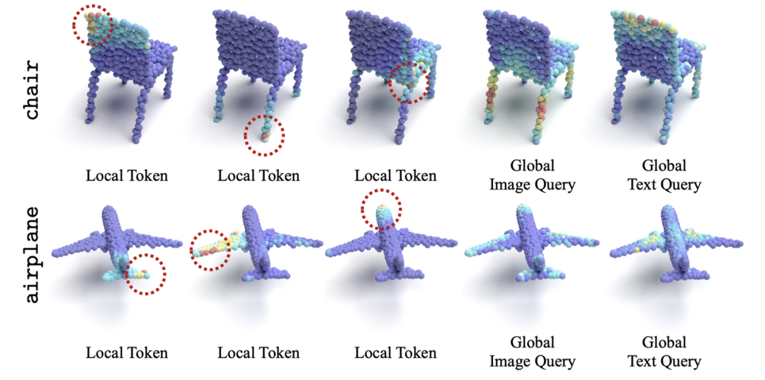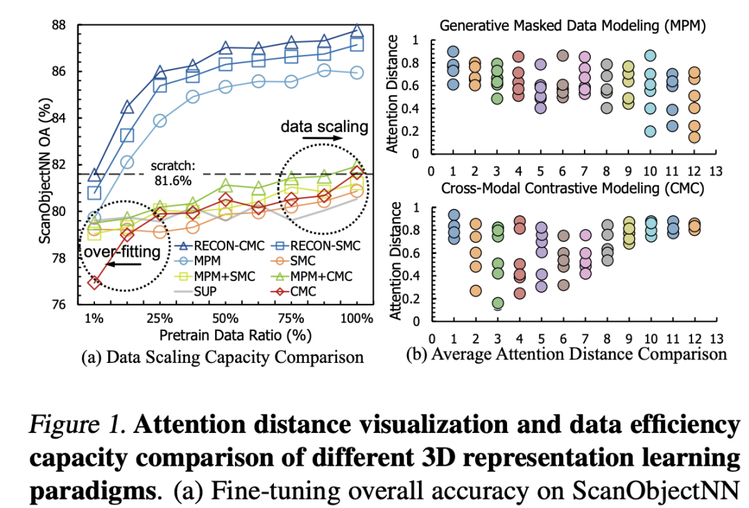 我们还研究了MPM(MaskedPointModeling)、CMC(Cross-modalContrastive)在感受野和注意力区域上的区别,类比2D中ViT的AverageAttentionDistance[4],我们根据3Dpatch中心之间的欧式距离和attentionmap权重来生成3DAverageAttentionDistance,结果在图(b)中展示。我们观察到一个模式差异问题,即对比模型的注意力主要集中在全局领域,其注意力距离逐步上升并趋于一个较高值,而生成模型对集中的局部注意力有兴趣,这与Xie等人在2D的观察结果一致[5]。