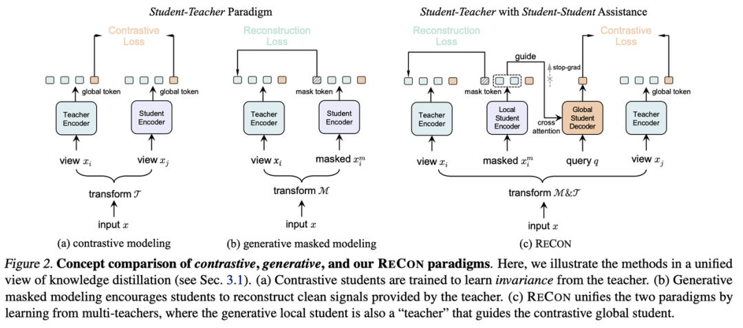 在知识蒸馏的视角下,我们统一了Contrastive和Generative两种自监督范式,由此引申出ReCon模型,通过多教师蒸馏与学生协同学习下的自监督模型(student-teacherknowledgedistillationwithstudent-studentassistance)。Localteacher通过局部语义的复原来使Localstudent学到丰富的局部知识,Localstudent向Globalstudent提供局部知识以帮助其全局知识的学习。