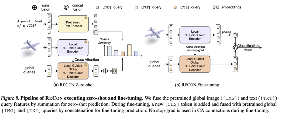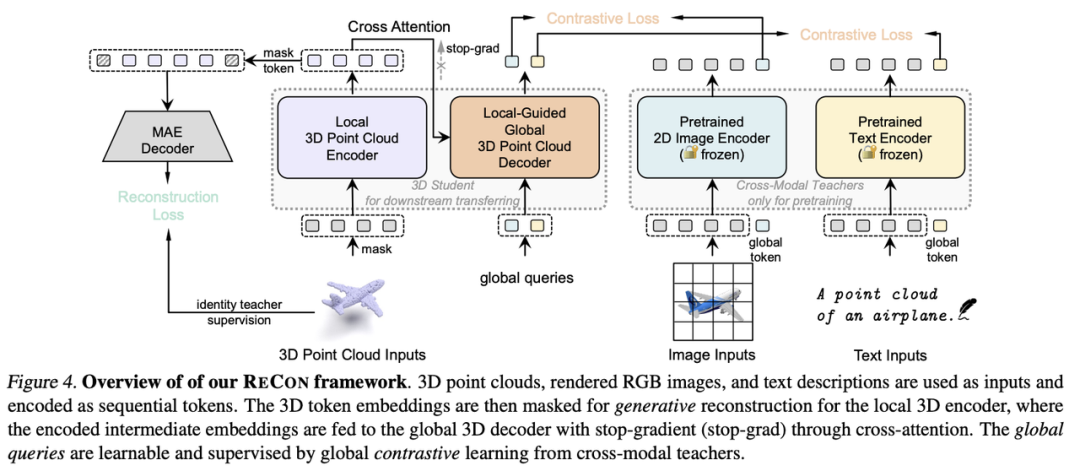 我们在主图展示了ReCon的encoder-decoder框架,其中PointIdentity作为Local3DPointCloudEncoder教师,跨模态预训练模型作为Global3DPointCloudDecoder教师,这种配置在后续的消融实验被验证有最优的效果。我们使用timm[13]或CLIP[7]的视觉编码器作为ReCon的2DTeacher,CLIP的文本编码器作为ReCon的TextTeacher,并在后续的消融实验发现freezeparameter有利于知识的迁移。对于Local3DPointCloudEncoder,我们完全采用MAE式的非对称结构,来防止位置编码在点云重建中可能附有的知识泄露。