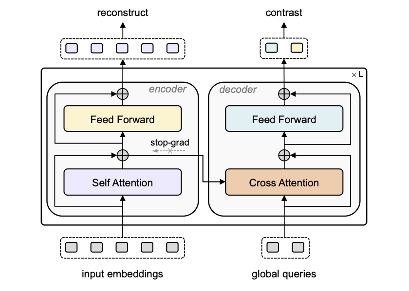 在模型结构上,我们使用了类似BART[14]的encoder-decoder结构,每个Stream在一个layer中均包含一个Attention层与FFN层,其中encoder的inputsembeding产生CrossAttention的K与V,并使用stop-grad来防止梯度干扰。由于globalqueries一般仅包含少量的几个token,在运算效率上并不会比单流网络增加很多。