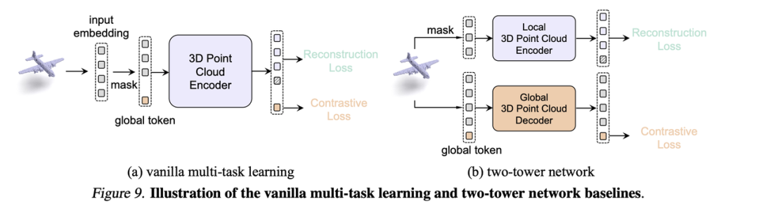 为验证模型的收益并不来自教师,而是因为ReCon结构是一种优良的Generativelearning和Contrastivelearning结合方法,我们在论文的附录C中探究了另外两种掩码数据建模和对比学习结合的方法,包括VanillaMulti-taskLearningFusion和Two-TowerNetwork,他们都用了包含预训练权重的跨模态教师来做指导。