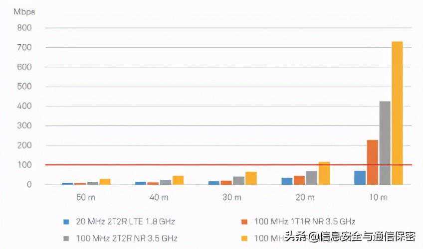 当前VR/AR/4K/8K等新应用对带宽都具有非常高的需求;VR/AR的带宽要求在100Mb/s以上,4K的带宽要求在50Mb/s以上;5G采用了高频宽的方式提升用户带宽,在Sub-6G下最大支持100MHz的频宽,在mmWave下最大支持400MHz的频宽。5G室内有源分布系统采用的4T4R天线单元,边缘速率要达到100Mb/s,通常要配置100MHz的频宽(如图5所示的仿真),而且需要部署跟AP数量相当的小基站,从而大大增加室内5G覆盖的成本。
