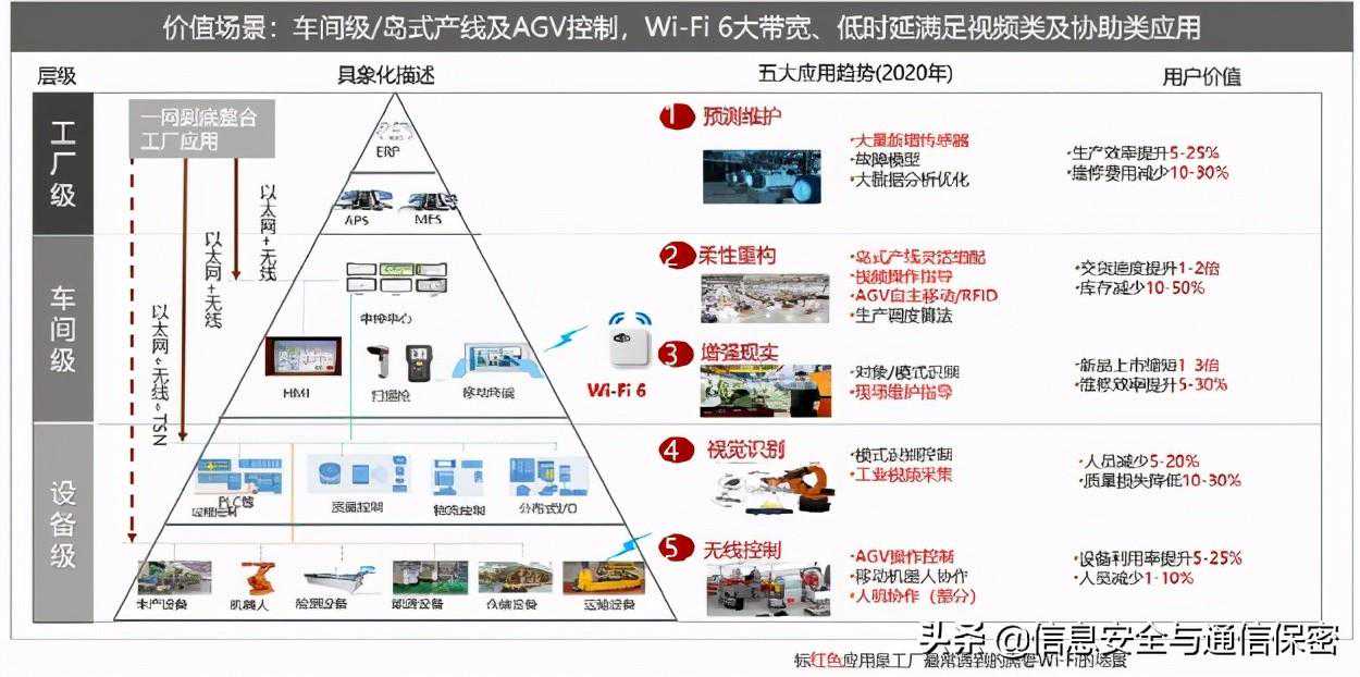 随着传感器/AGV/工业AR/机器视觉规模应用兴起,车间级宽带物联无线成为刚需,设备时延敏感网络正在起步。Wi-Fi6网络低时延、大带宽的特点,将其应用场景从室内办公延伸到与工业生产的相关场景。