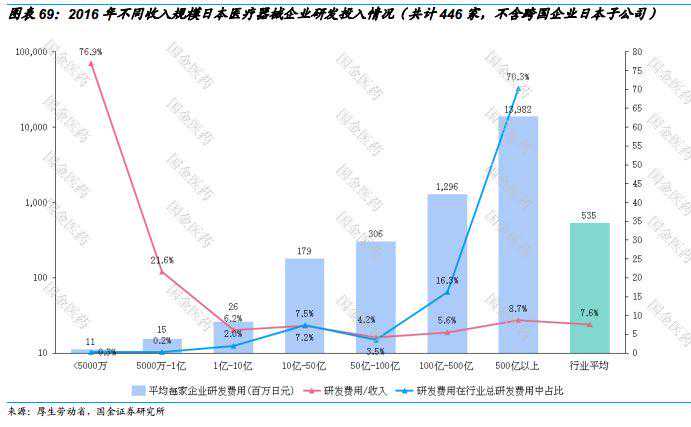 研发投入方面,日本医疗器械企业普遍重视研究开发,行业总体研发费用约占行业收入的7.6%左右,其中小型企业(收入1亿日元以下)处于初创阶段,研发活跃,研发费用比例很高;而特大型企业虽然只占全行业企业数量的3%,但贡献了全行业70%以上的研发费用。