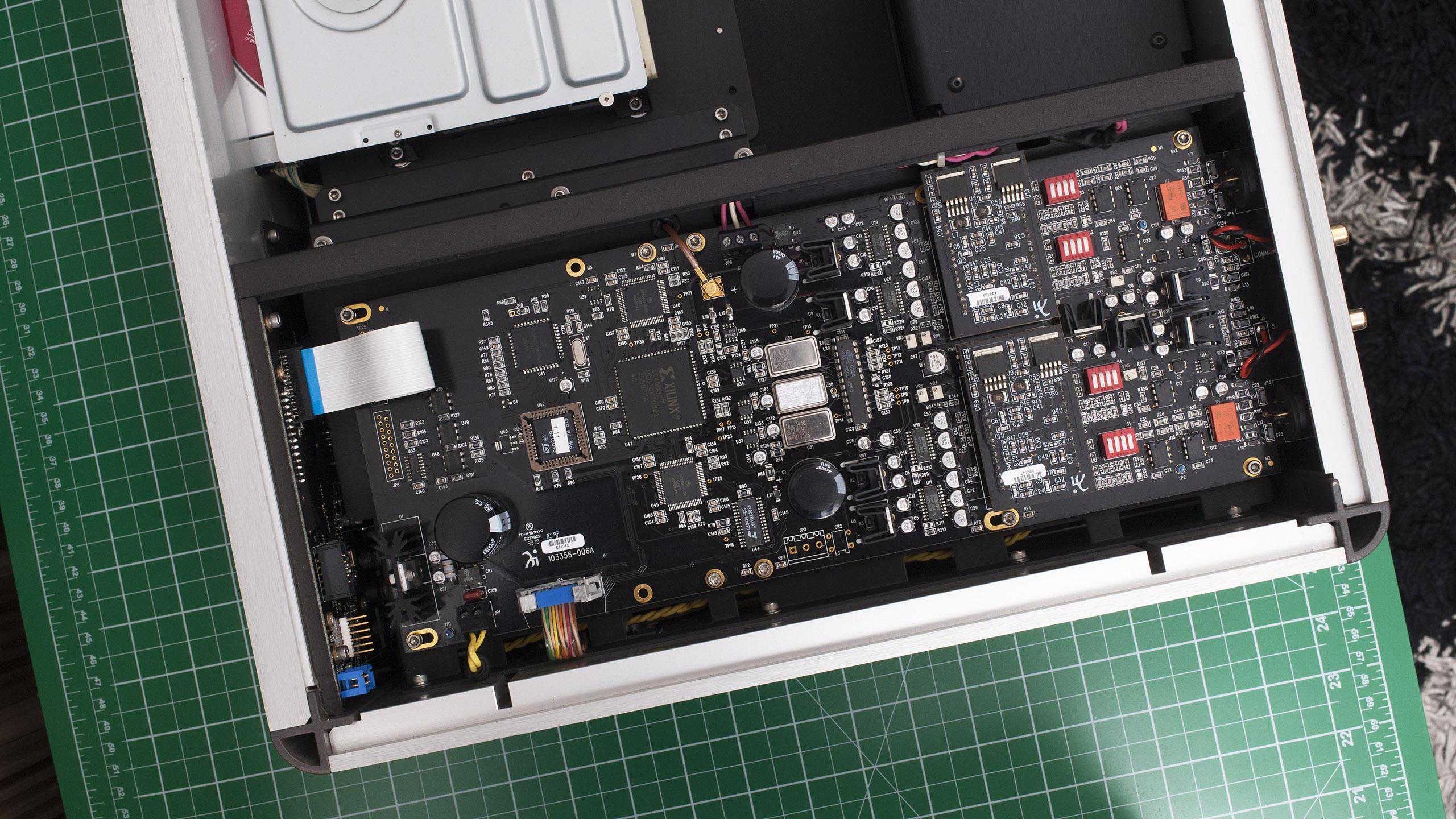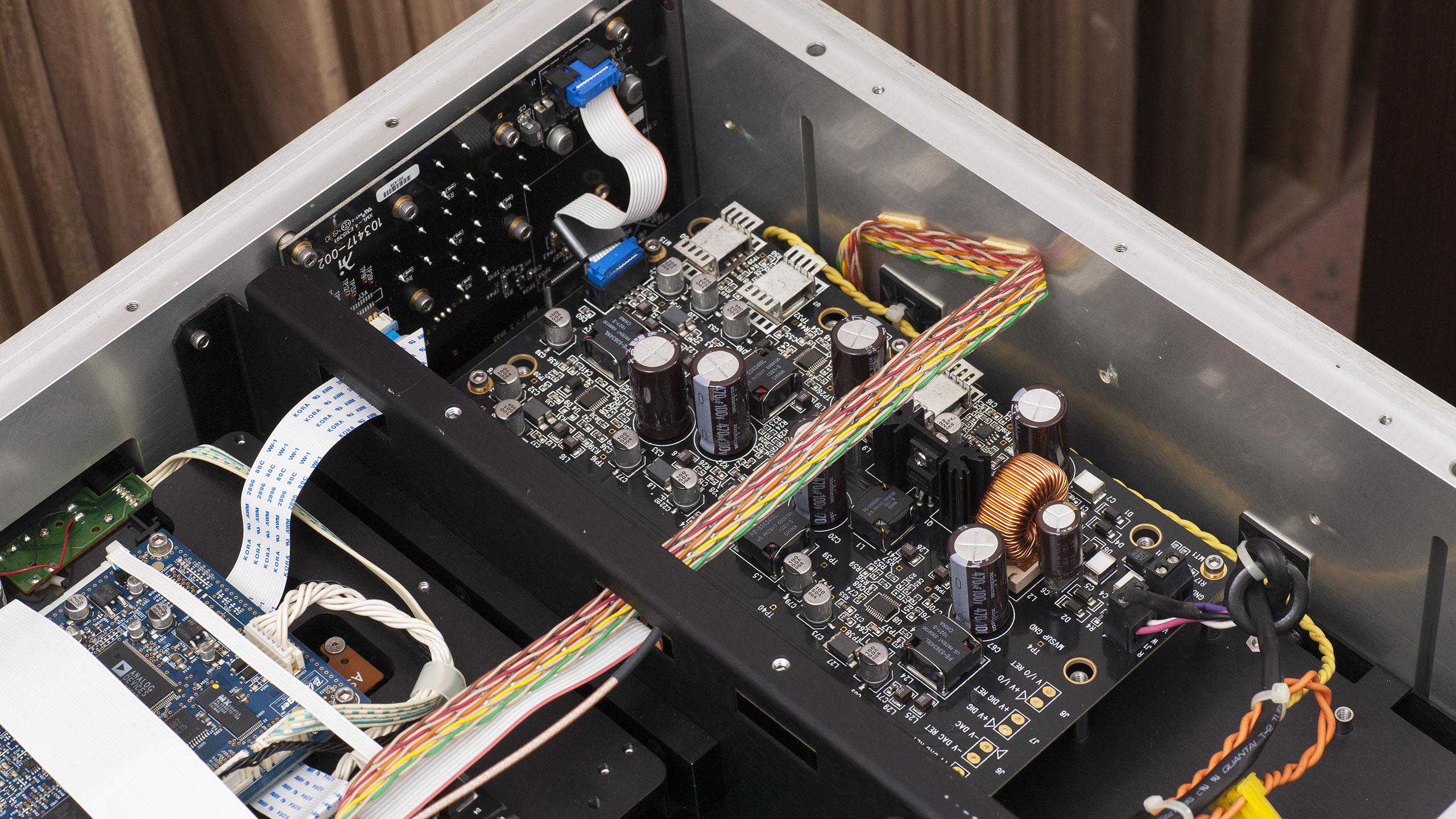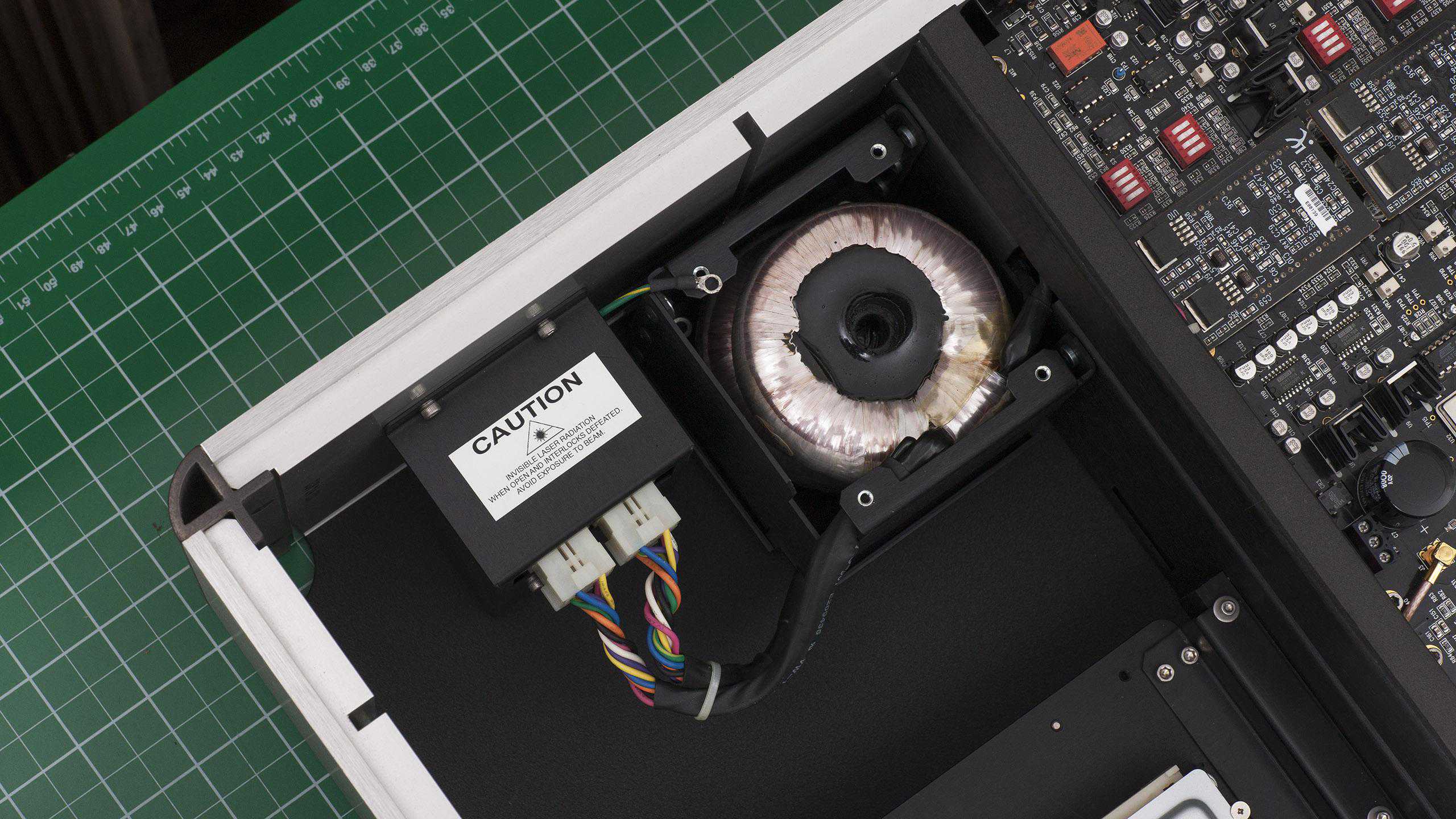 Wadia381内部非常的整洁,分为了两个区域,电源/光驱与电路板之间使用铝板隔开,同时电源还使用了屏蔽罩,以达到更好的电磁屏蔽性能。