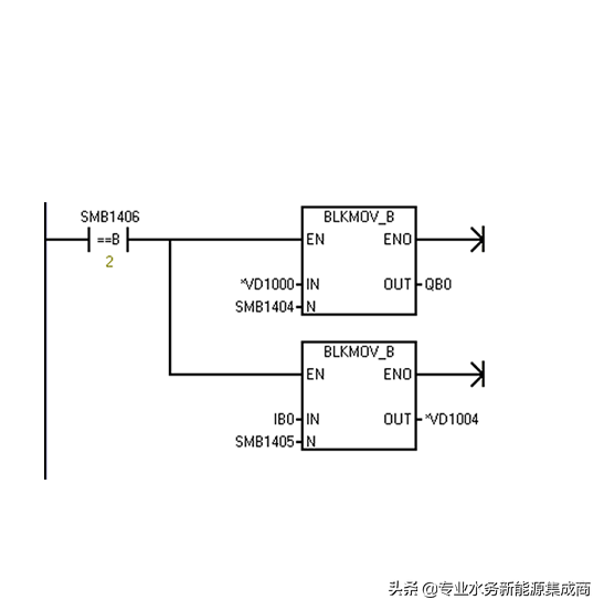 下面显示的是适用于CPU上插槽0中的PROFIBUSDP模块的示例程序,该程序使用SM存储器中DP端口信息。该程序通过SMW1402确定DP缓冲区位置,通过SMB1404和SMB1405确定缓冲区大小。这些信息用于将DP输出缓冲区的数据复制到CPU的过程映像输出寄存器。同样,CPU的过程映像输入寄存器中的数据则被复制到V存储器输入缓冲区。