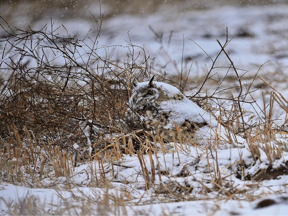 图片描述:在一个下雪的早晨,我开车来到湿地寻找心中鸟,开车转悠很久,心中的它一直没有出现,雪一直下,天越来越冷,正当我停车准备收拾设备回家的时候,抬头看见前方不远处有一堆草丛,我习惯性拿出望远镜看过去,立刻我就热血沸腾了,终于看见心中的它正静静地趴在草丛里,身上大部分被大雪覆盖着,其他部位又和草丛十分靠色,雕鸮与生俱来的保护色大大增强了它的安全系数。只要它不动,一般人还真很难发现它的存在。我怀着忐忑的心情慢慢把车开近一点,逐渐靠近、在我估计的安全距离选好角度停车打开窗户,拿出相机激动地按下快门记录它身影。
