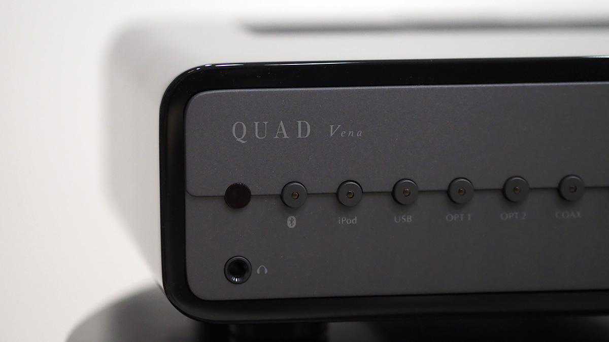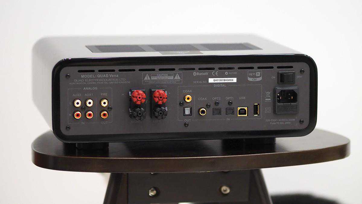 Quad国都Vena功放外观同样采用锃亮的钢琴烤漆,而其电路则是为满足年轻人需求的一体式设计:除了能够提供45w每路(8Ω)的输出功率外,最大特色就是能够容纳从传统模拟到蓝牙数字在内的各种音源。我看了下,Vena机身后面板上可以选择AUX/光纤/同轴/USB(大A口)等各种端口并同时带有aptX高品质蓝牙音频编码标记,可谓全能!同时,这台全功能的一体式功放居然除了有正面的耳机输出外,后背还带有模拟的PRE前级输出。理论上可以把它作为前级功放进行数字信号解码并输出给更大推力的后级功放使用。