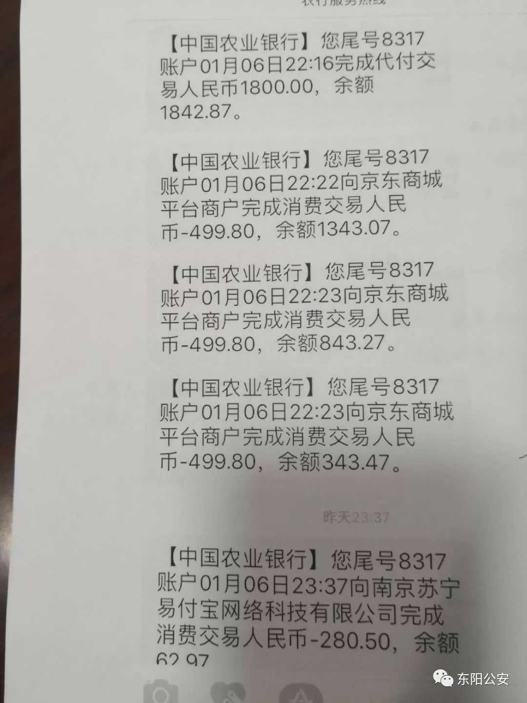 怎么又要借钱了?这一次楼女士的疑虑加深,便在手机上操作时给一个做云集的朋友打电话咨询,结果证实自己被骗了:“1月6日晚上11点37分,我的手机就收到农业银行的消费短信,分了4笔把我的1800元全部消费了,其中三笔分别是499.8元转到了京东商城平台商户里,一笔是280.5元转到南京苏宁易付宝网络科技有限公司。”