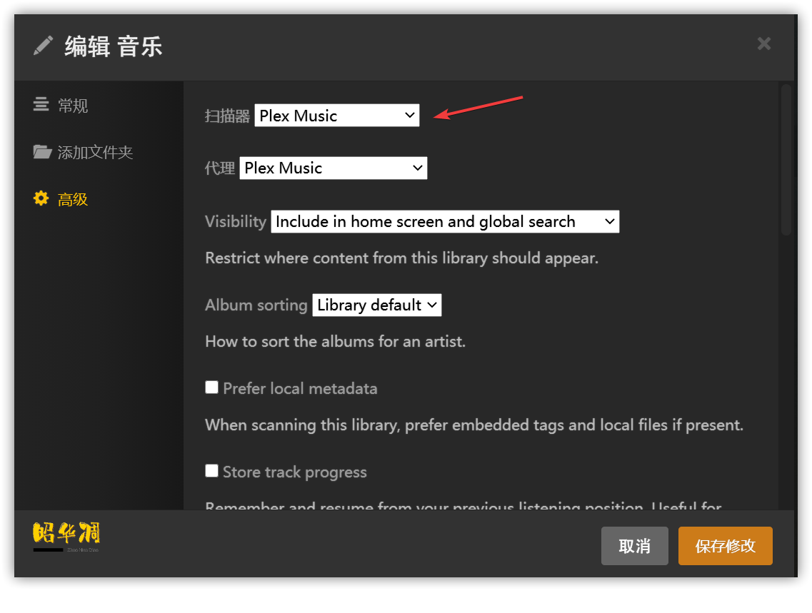 ▼高级选项这里选择扫描器,默认只有PlexMusic.