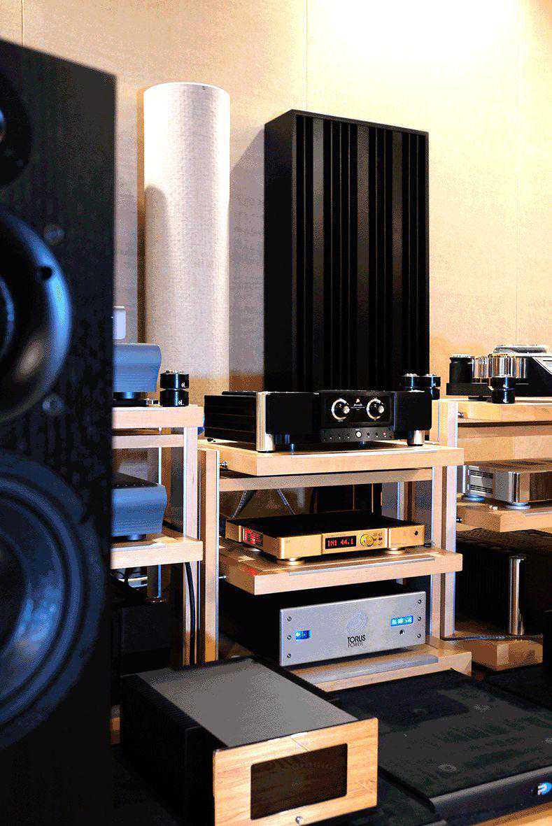 琳琅满目的HIEND器材,后排亮灯的两台就是声雅PSM-300T双单声道后级,定价29998元一对